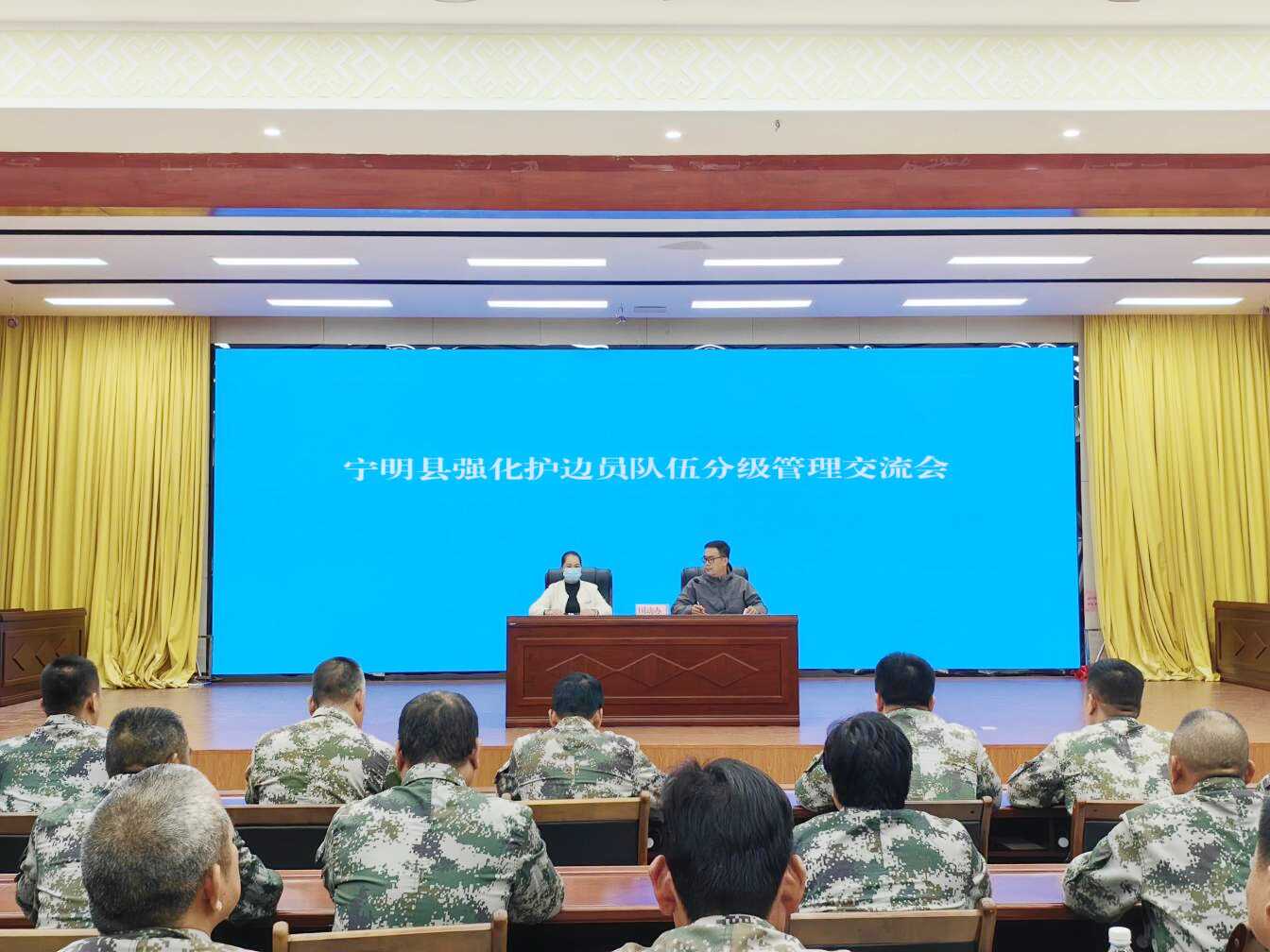 图为宁明县国动办党组成员招集护边员片长、组长举行宁明县强化护边员部队分级办理交流会